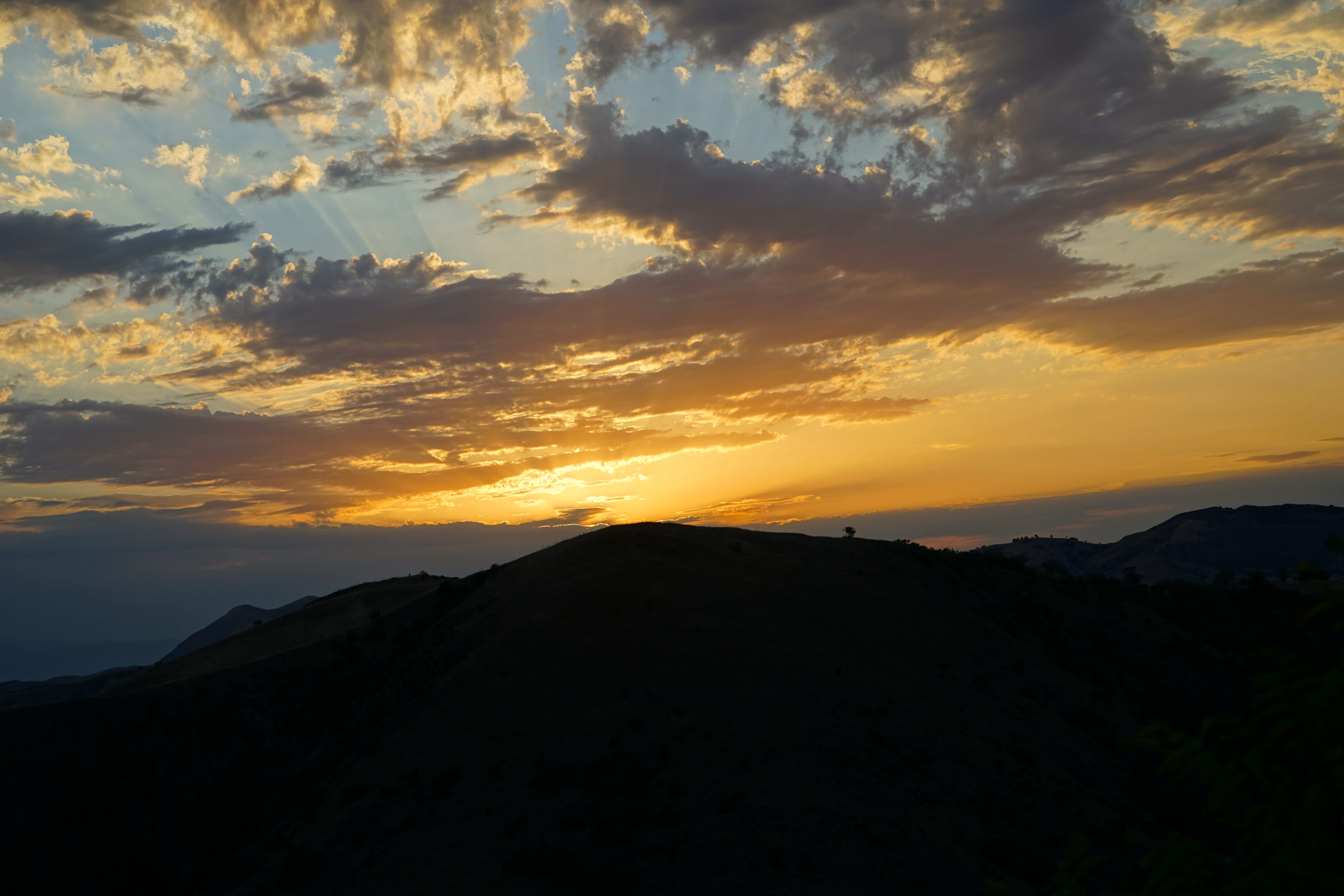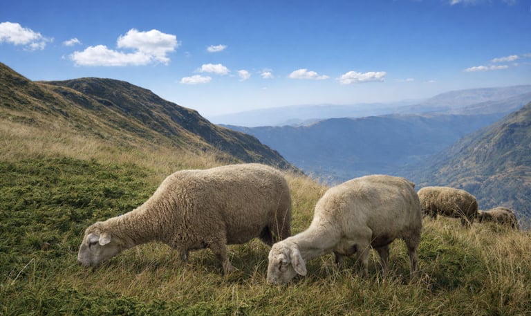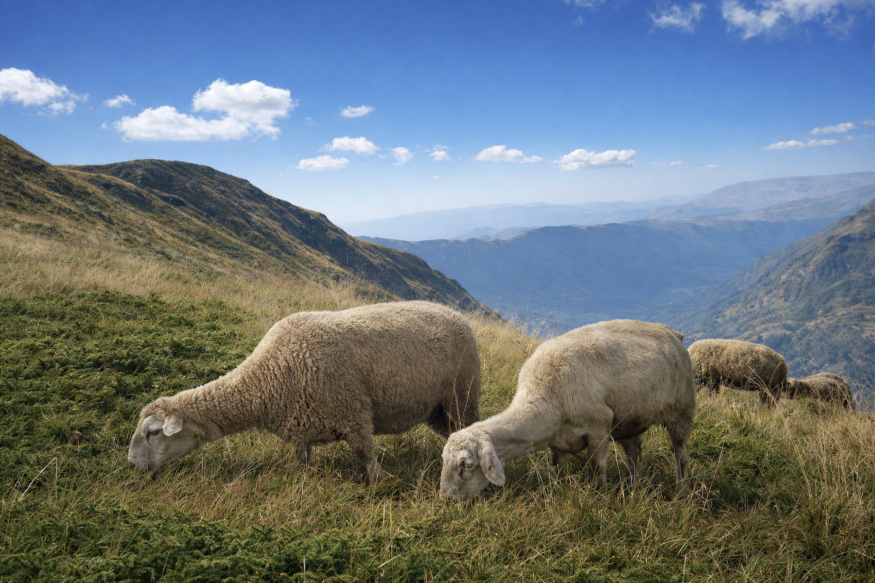Grazing sheep ascending onto the mountain plateau near Patishka Reka, North Macedonia.